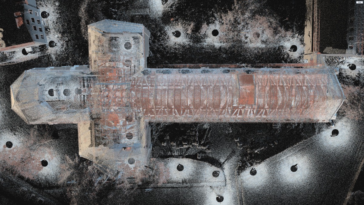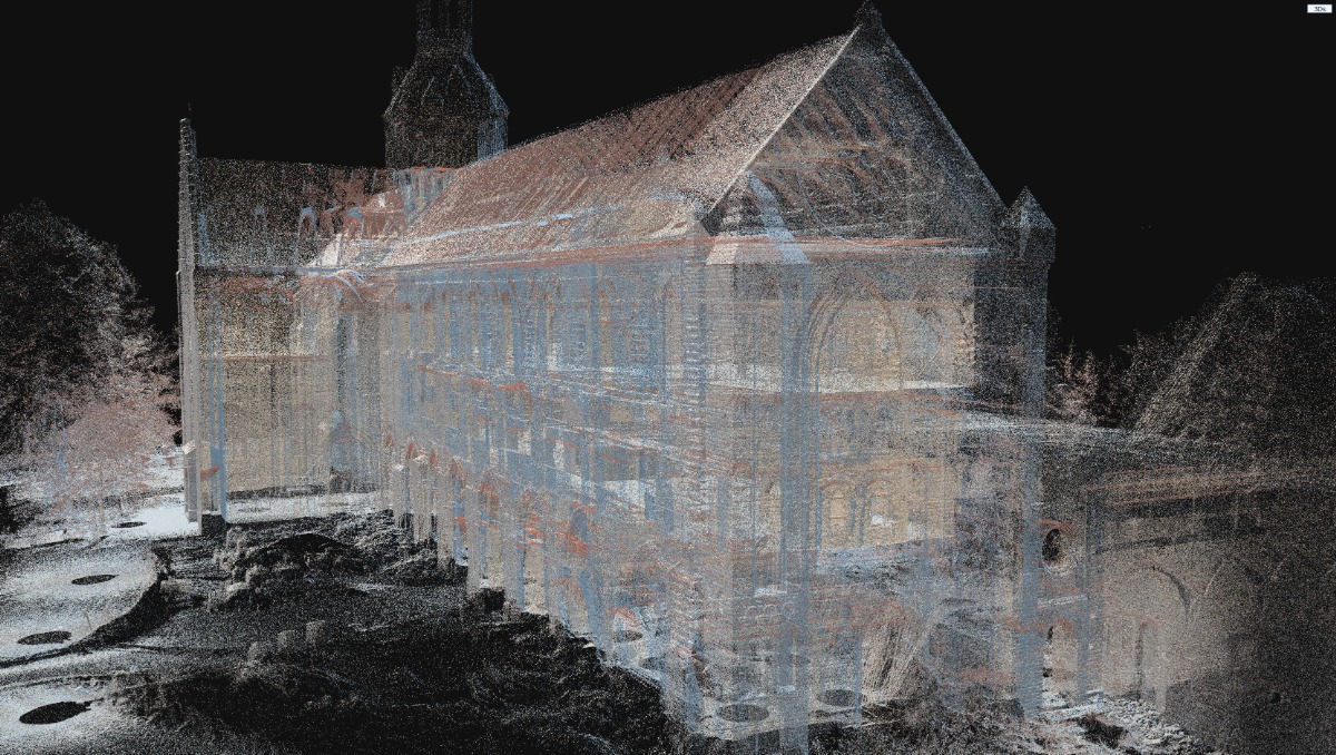 - skaning 3D architektury wnętrza oraz zewnętrznych murów kościoła, stodoły i domu opata oraz wygenerowanie chmur punktów.